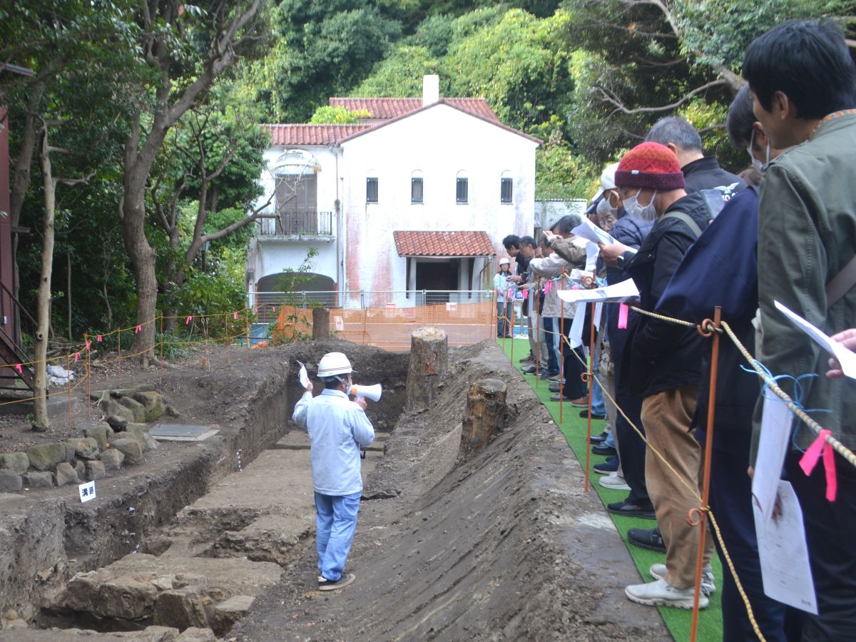 旧前田邸洋館前 解体をやめさせよう②鎌倉市は9月から長谷の旧前田邸洋館前の緑地で発掘調査を実施しました。11月16日、現地で鎌倉市による説明会が午前、午後に分けて行われたので、午前の部に参加しました。発掘地点は洋館前の緑地の樹木を伐採し、A・Bの2地点で行われました。
